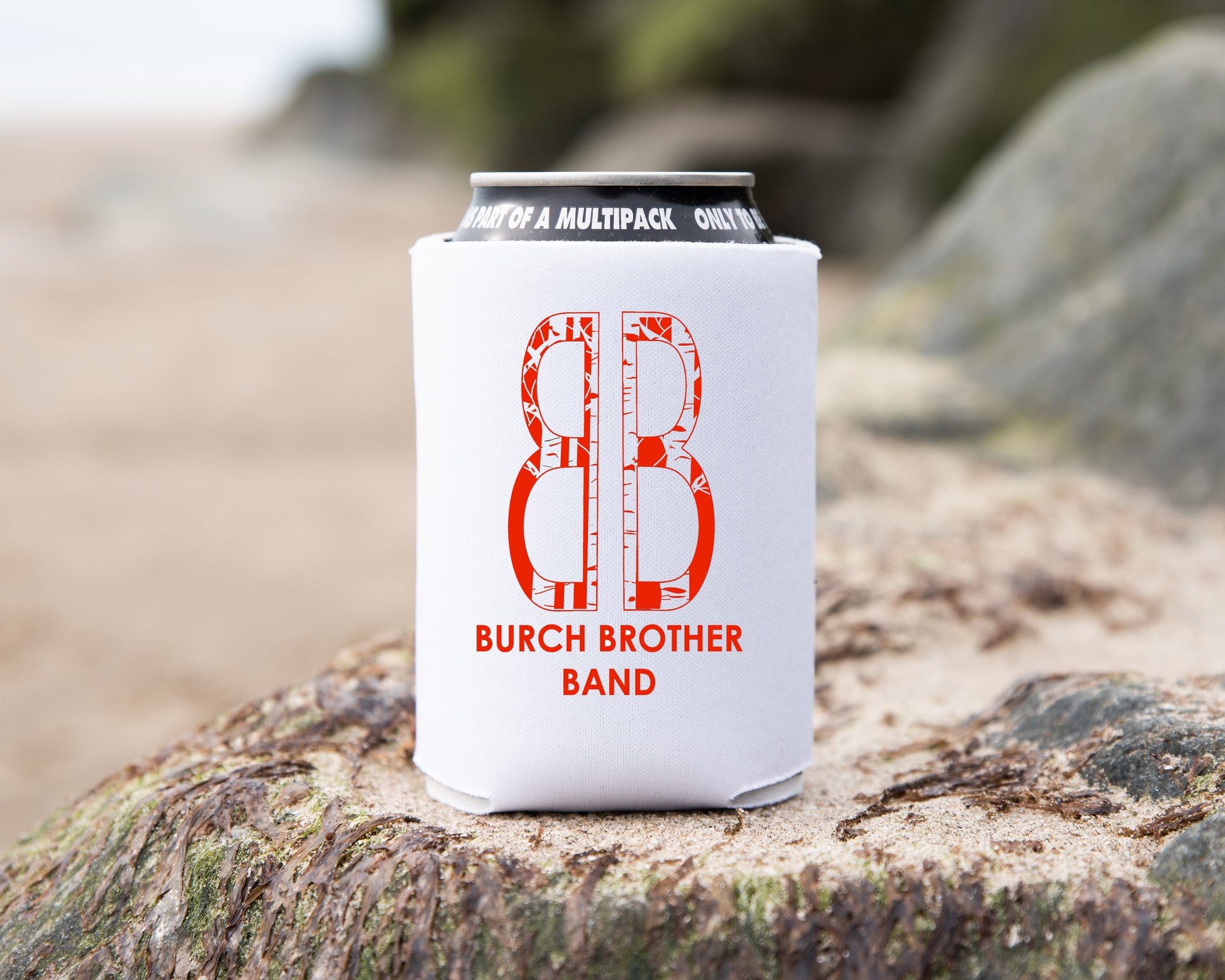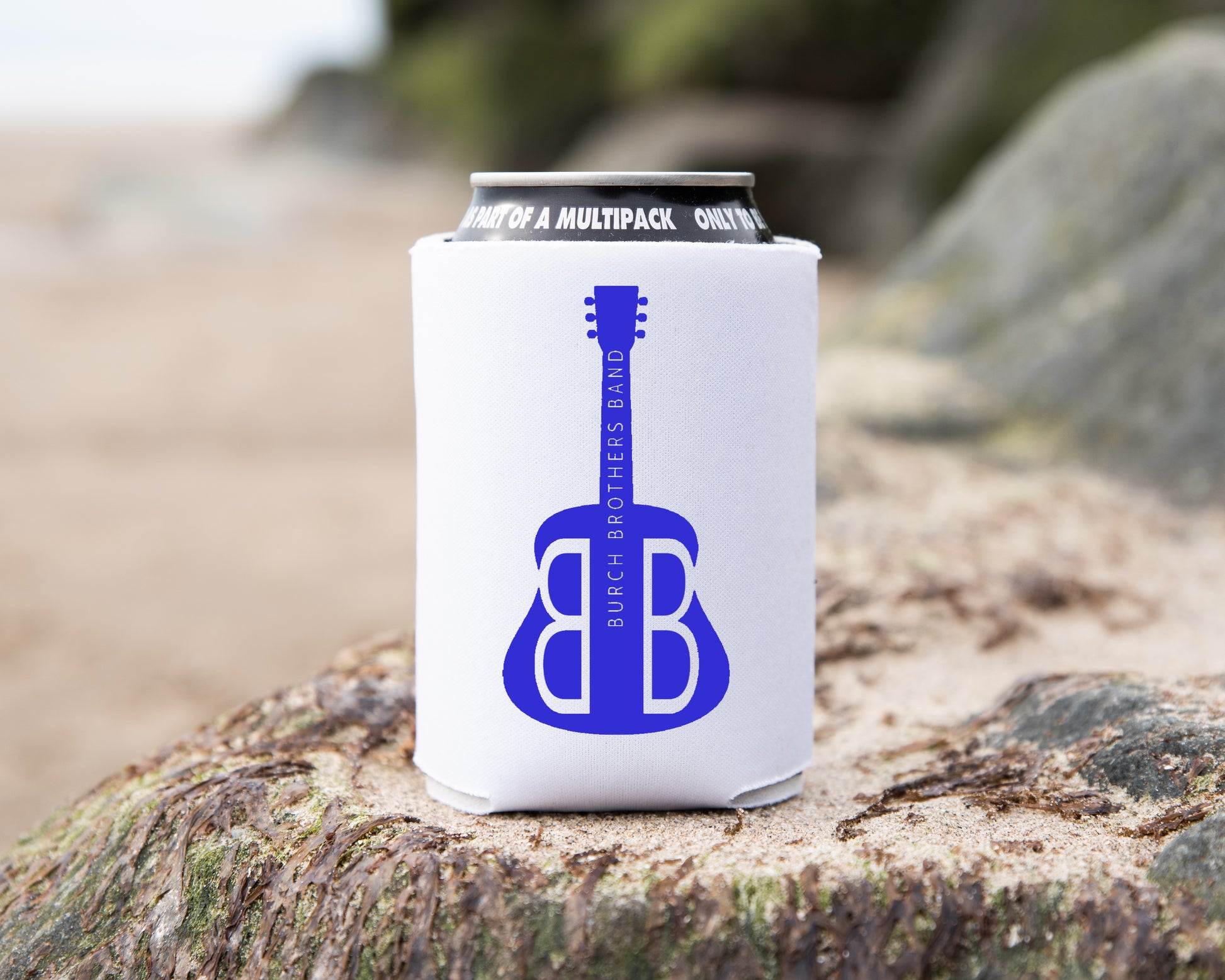Features red BB logo and a blue guitar! Designed for 12oz standard-sized cans. They also fit the bottom of 16oz cans and similar sized water bottles. Front and back designs. Polyester foam can koozie.